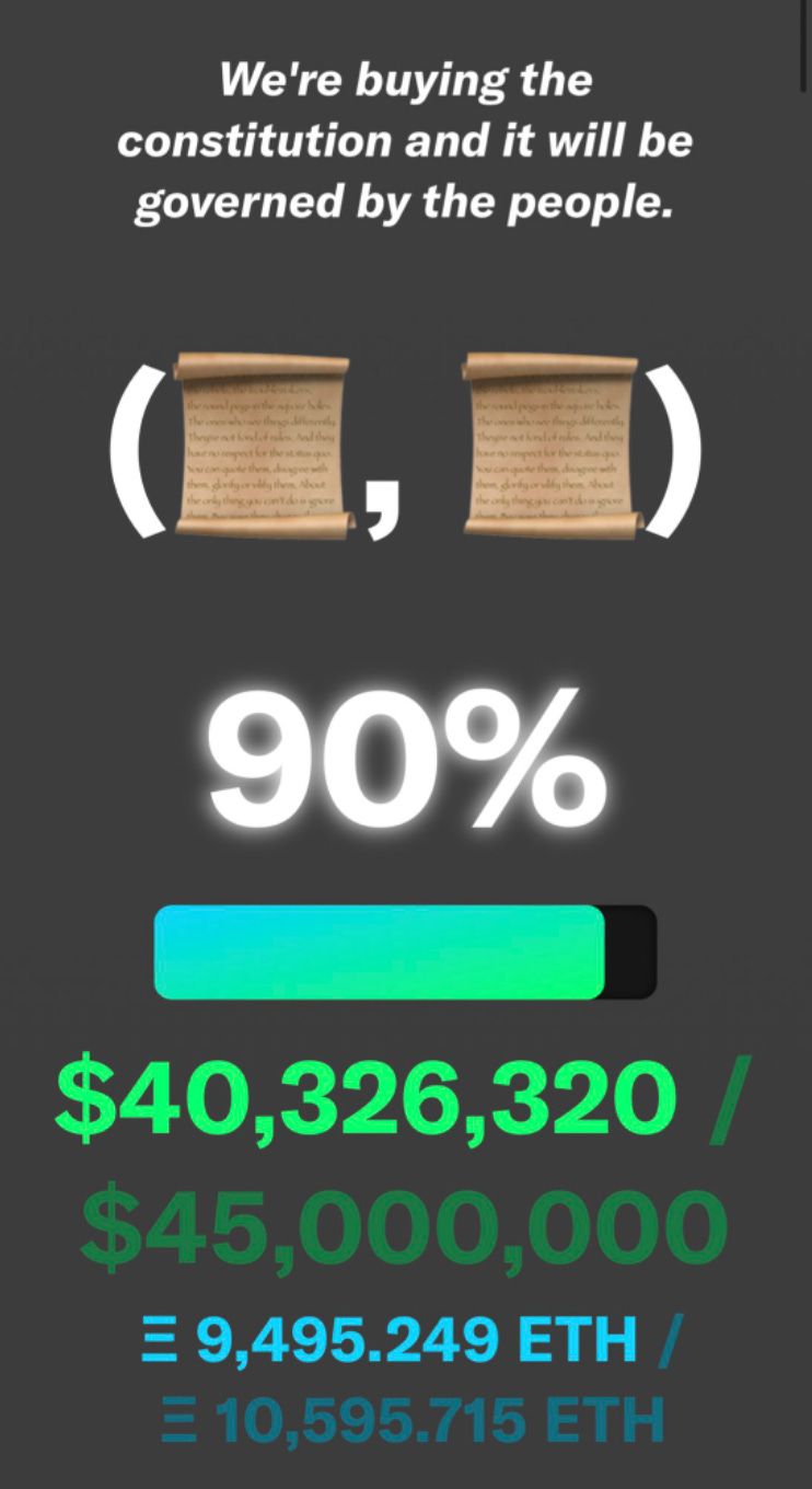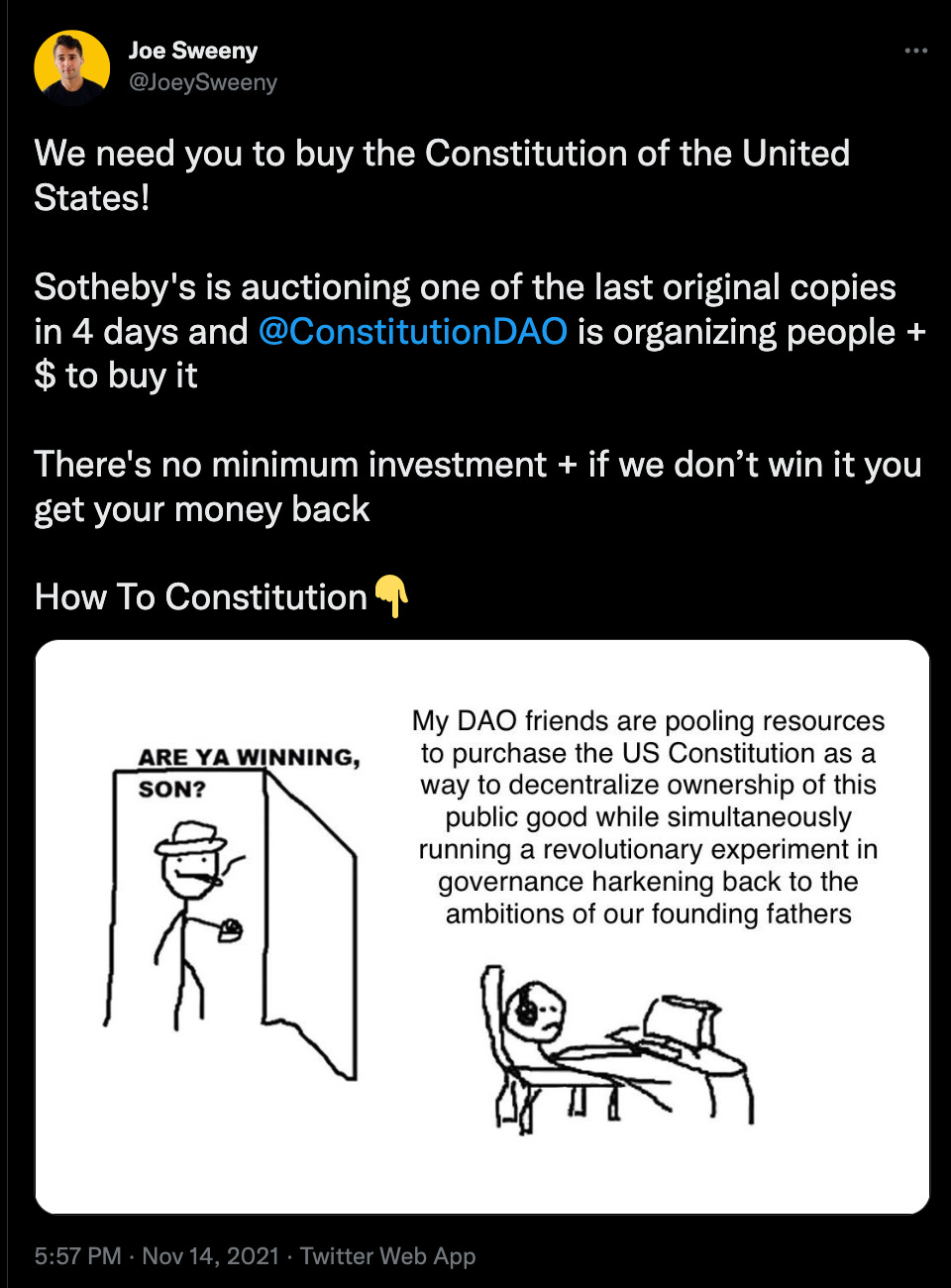 Some of you might have heard of the Constitution DAO. In November 2021, one of the only 13 surviving copies of the United States Constitution was up for auction at Sotheby’s, and among the groups that hoped to buy it was Constitution DAO, a digital group who pooled cryptocurrency to buy the documents. By donating to the DAO, investors received governance tokens, which would have granted them the ability to advise on how and where the constitution should be displayed and the mission of the DAO.