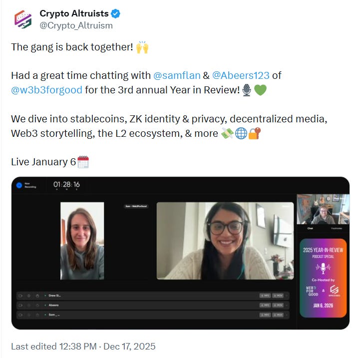 Earlier this week, we recorded our third annual year in review podcast with Crypto Altruists, where we go deeper on many of these themes. The episode will be released in early January. Stay tuned!